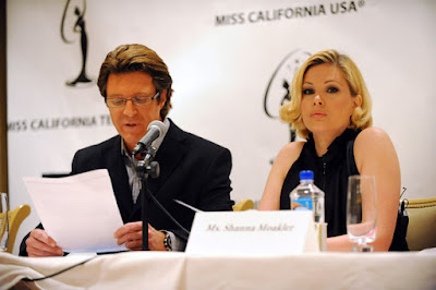Miss California USA Pageant executive directors Keith Lewis (left) and Shanna Moakler (right) held a Miss California USA Pageant press conference on May 11 during which they criticized Prejean for having appeared semi-nude on pictures prior to pageant and for making public appearances with groups opposed to same-sex marriage. (Photo by Amanda Edwards/Getty Images)